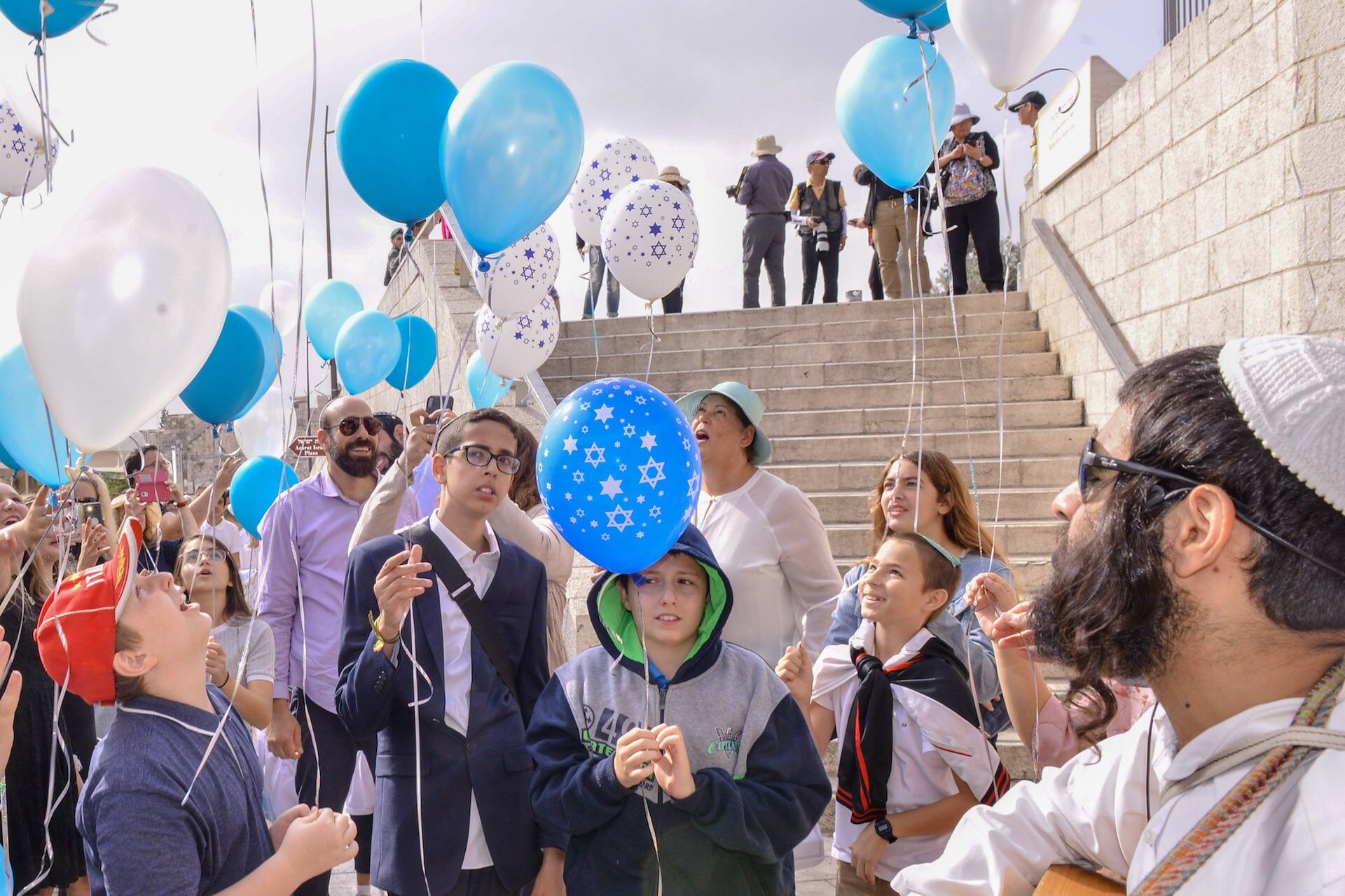 טקס בר מצווה בכותל – תופים, שופרות ושחרור בלונים כחול־לבן באווירה חגיגית