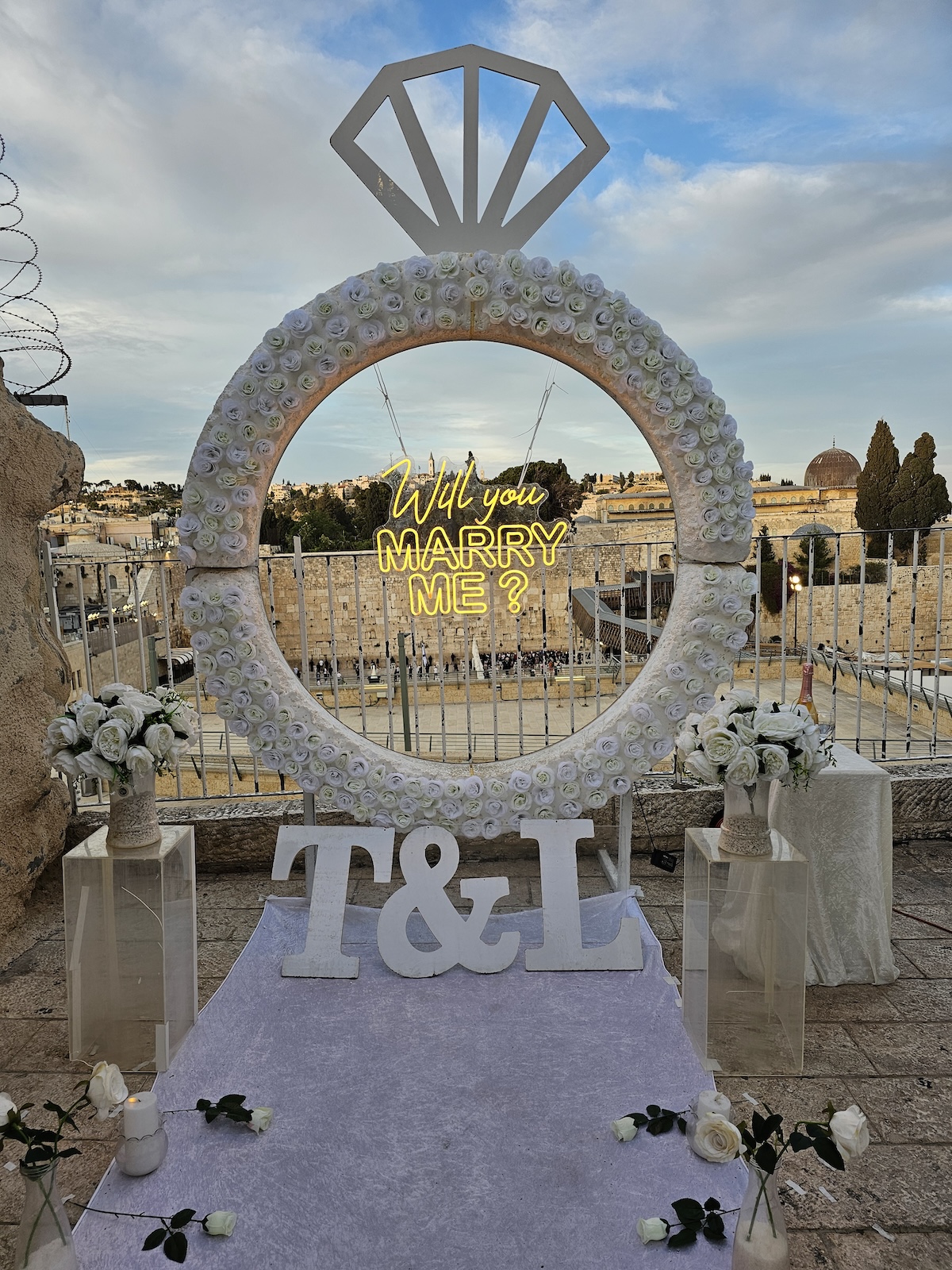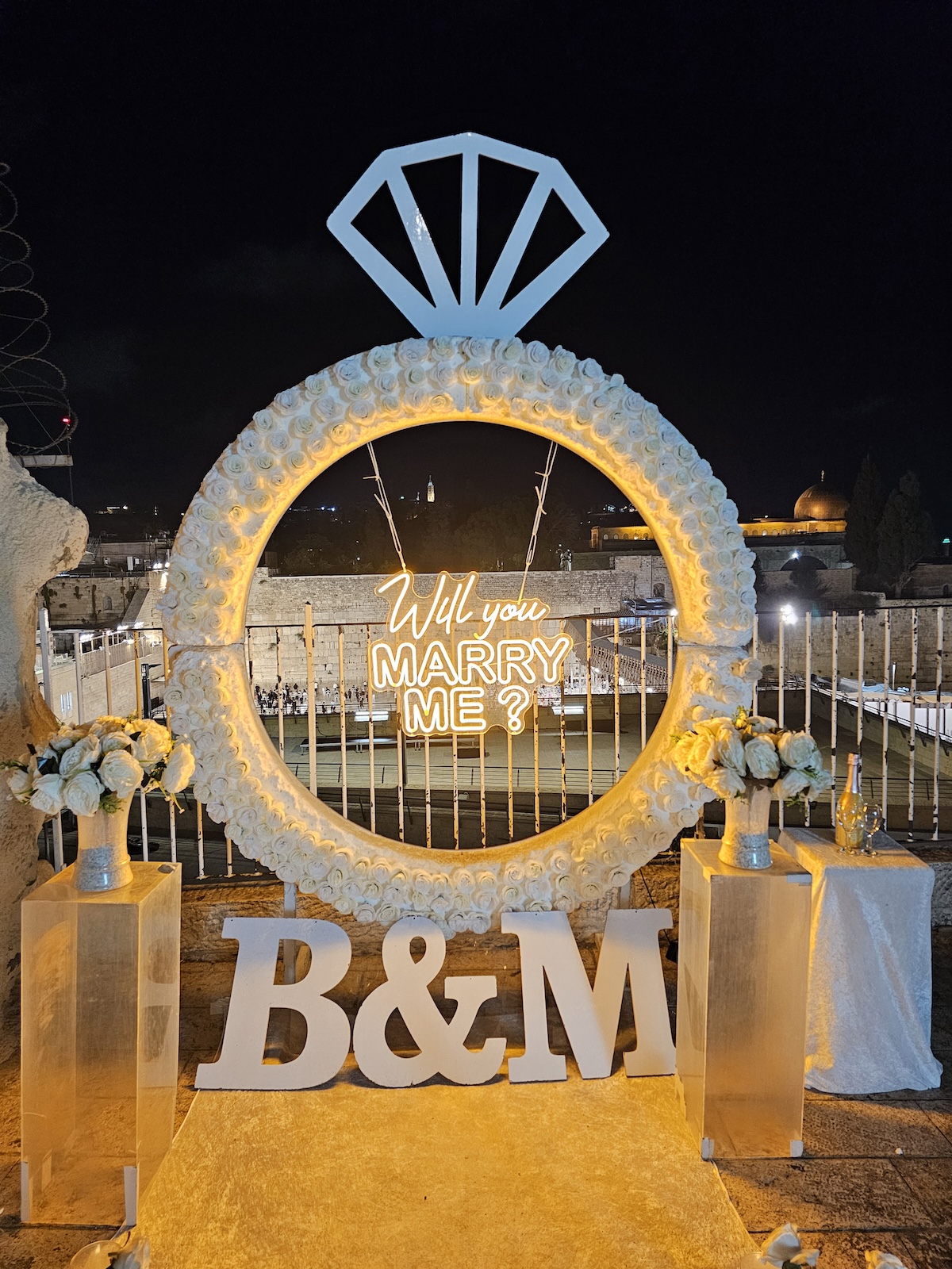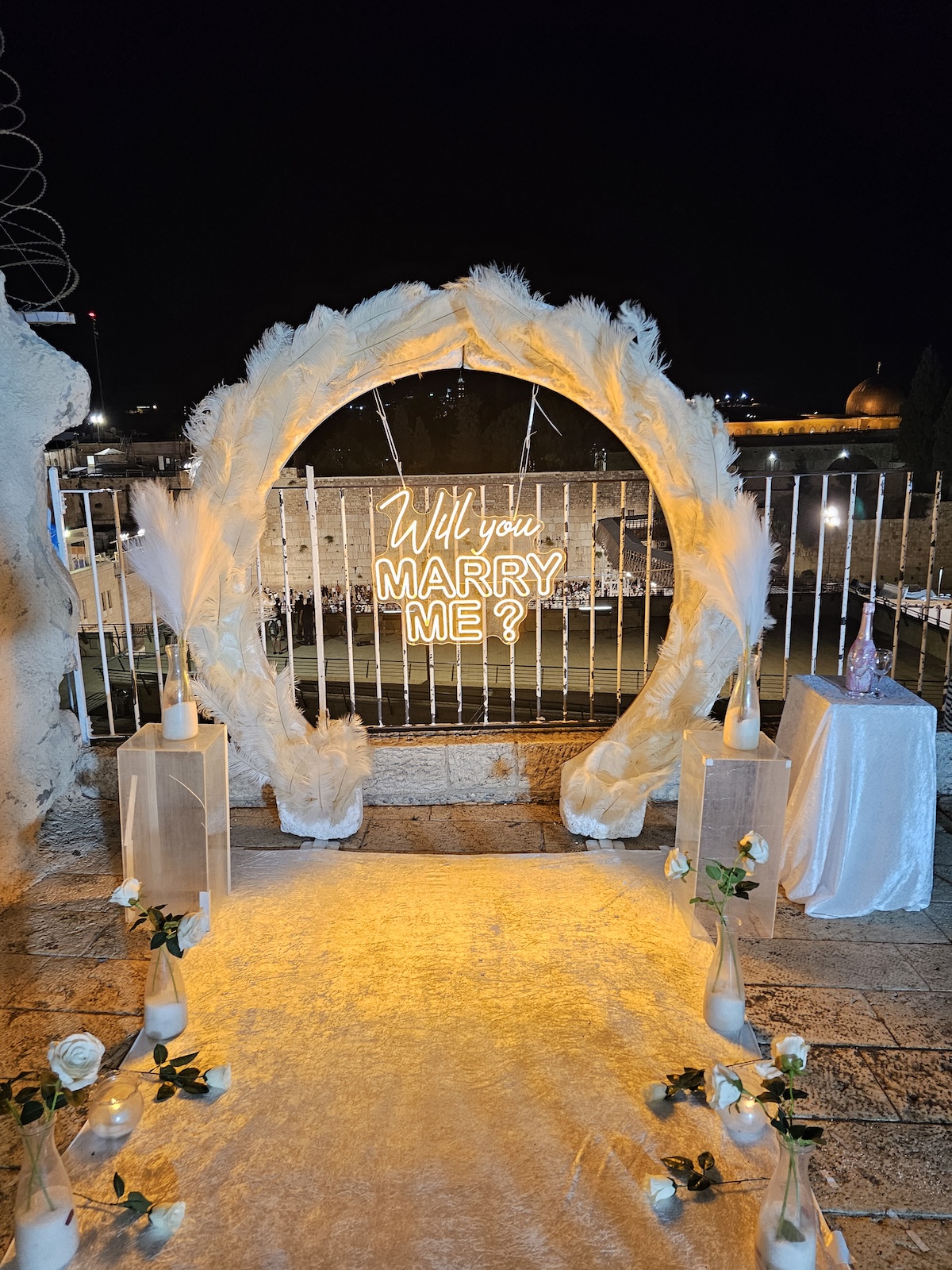 אנחנו נארגן לכם הצעות נישואין בכותל כוללות שמירת מקום תצפית מהממת לכותל, סידור בלונים, שלט גדול ומעוצב עם כיתוב השמות שלכם, זיקוקים, עיצוב המרפסת עם פרחים, נרות, בלונים, שטיח אדום ועוד.