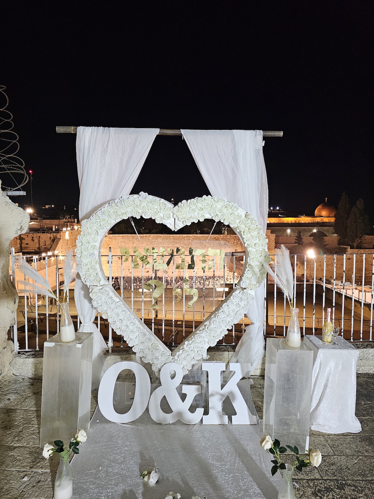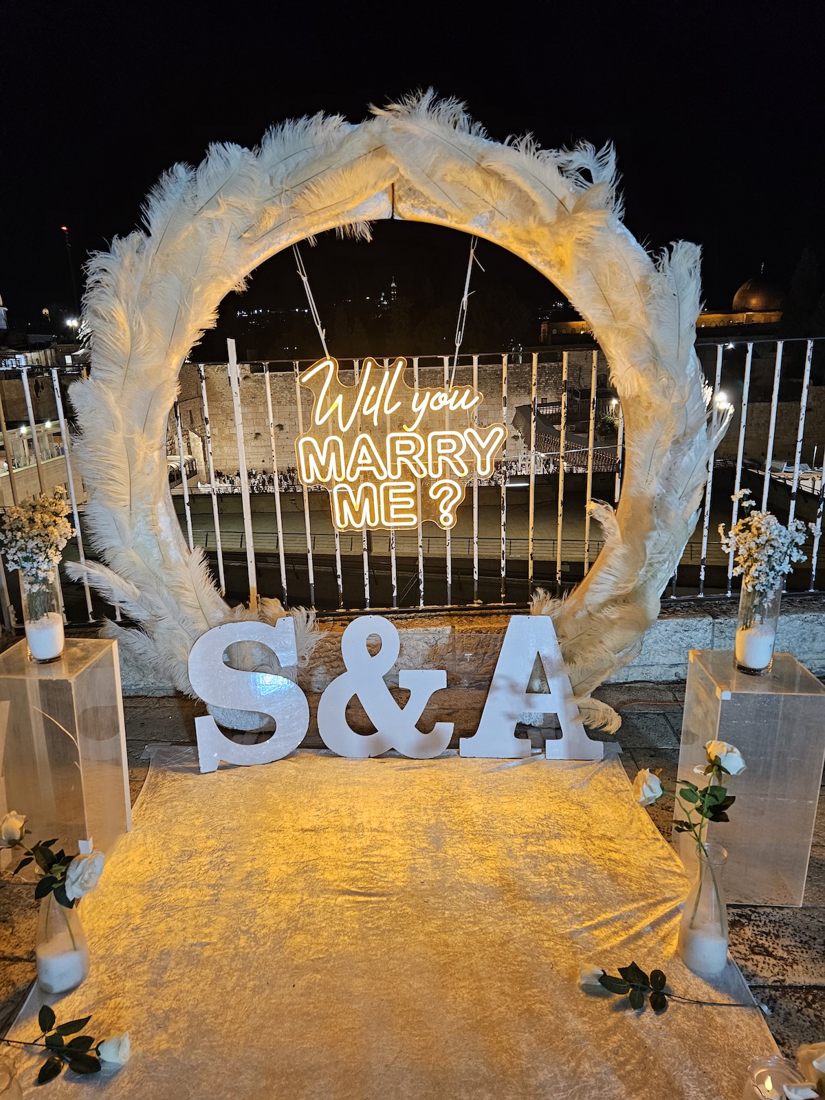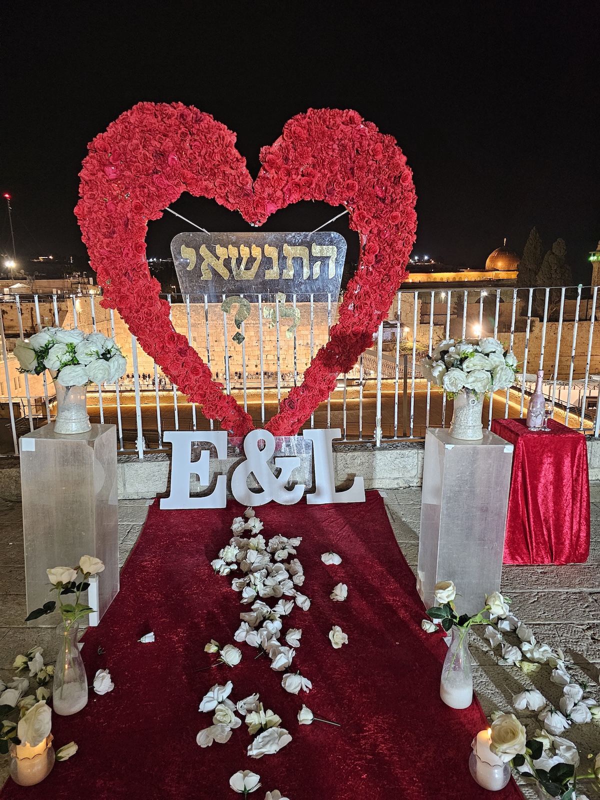 אנחנו נארגן לכם הצעות נישואין בכותל כוללות שמירת מקום תצפית מהממת לכותל, סידור בלונים, שלט גדול ומעוצב עם כיתוב השמות שלכם, זיקוקים, עיצוב המרפסת עם פרחים, נרות, בלונים, שטיח אדום ועוד.